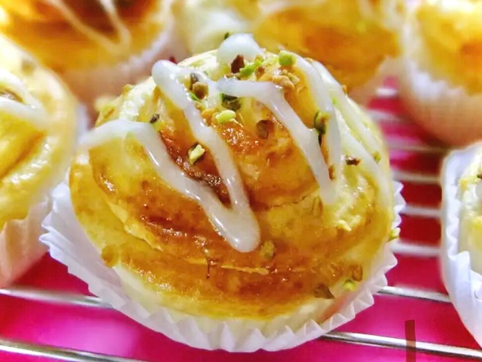 ⑤ 強力粉(国産)、牛乳、クリームチーズ、鶏卵、オレンジピール、砂糖、薄力粉、トランス脂肪酸フリーショートニング、塩、ピスタチオ/ドライイースト(一部に小麦、卵、乳、オレンジを含む)