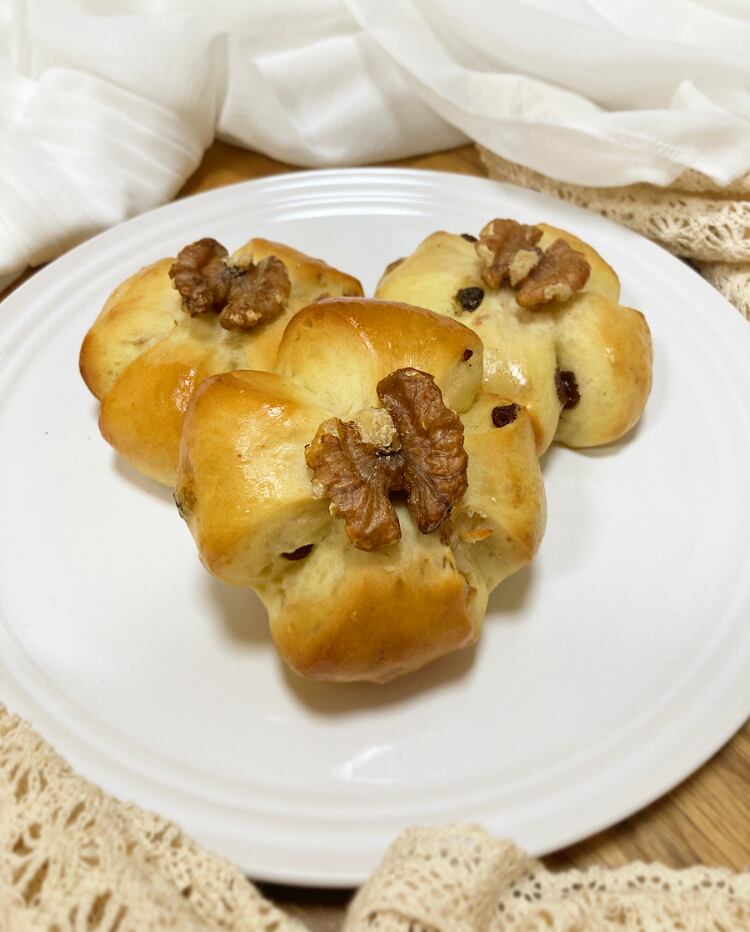 ほんのり黒糖の様な風味のあるパン生地に胡桃を混ぜて焼き上げました。チーズとの相性が良いパンです。