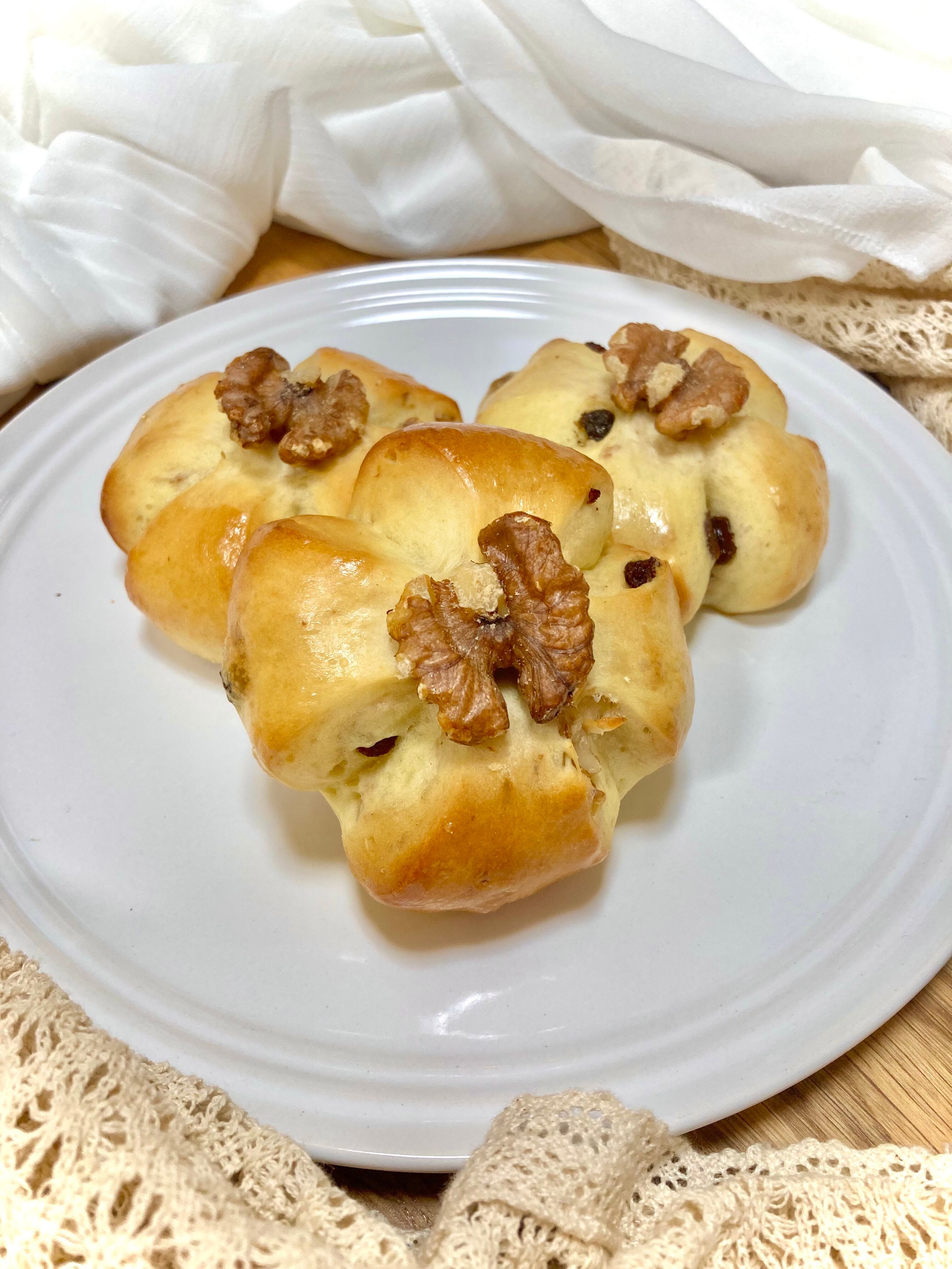 ほんのり黒糖風味のパン生地に胡桃を混ぜて焼き上げました。チーズとの相性が良いパンです。