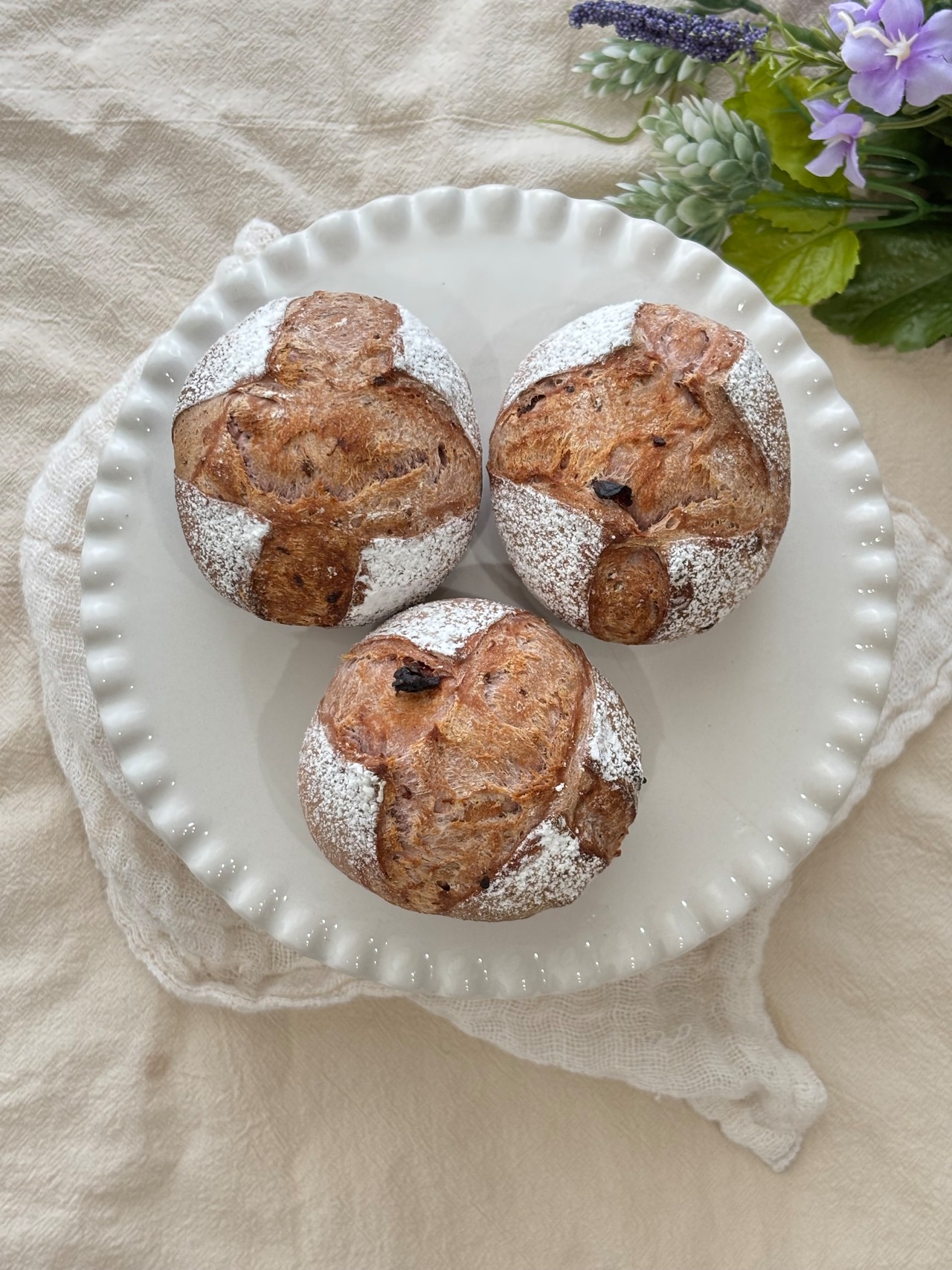 水は使わず赤ワインを使用!レーズンの甘みがアクセントになり、チーズやワインと相性の良いパンです♪