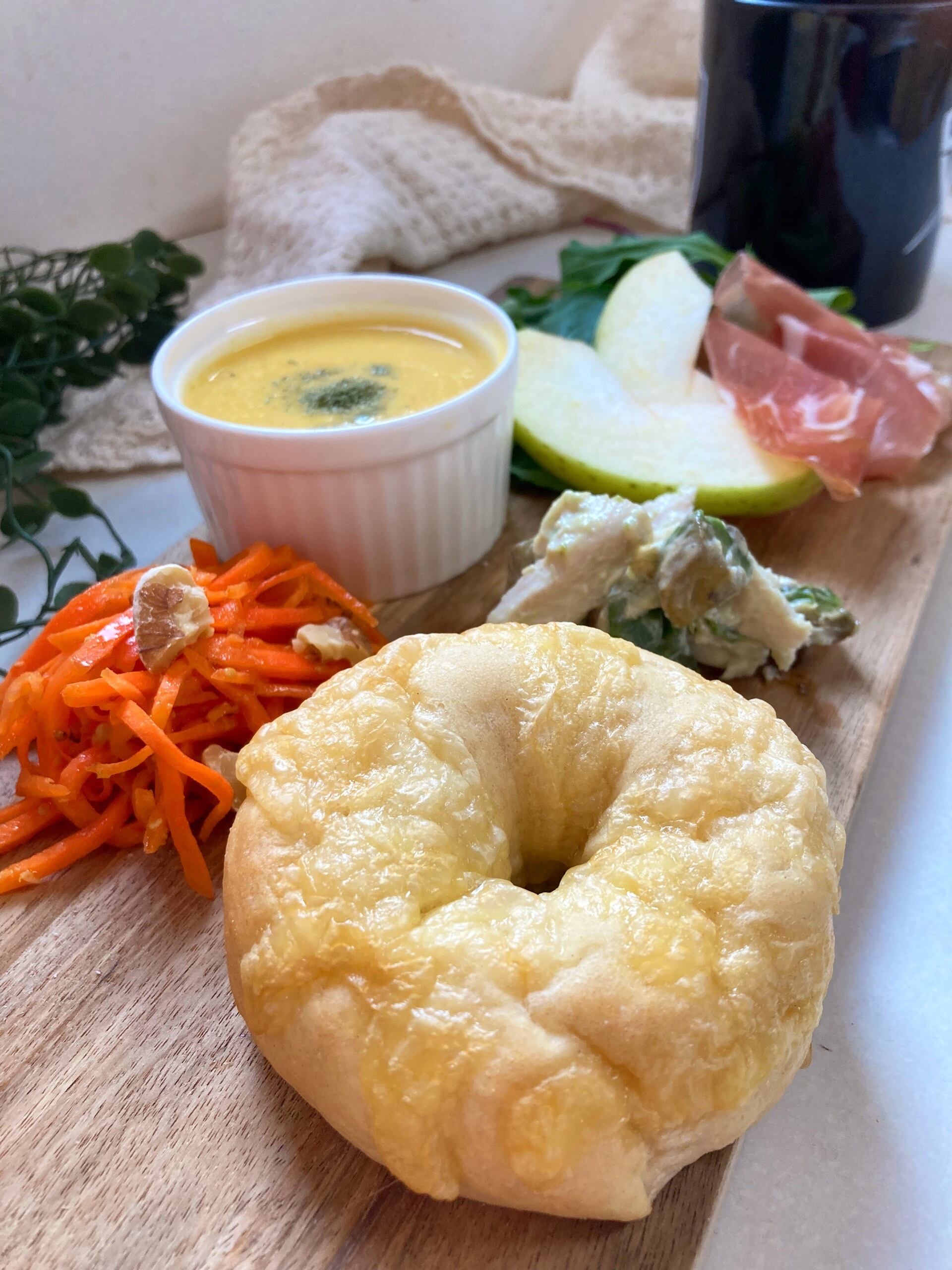 ふわふわ食感のベーグルにチーズを乗せて香ばしく焼き上げました。お好みでベーグルサンドにしてお楽しみ下さい♪